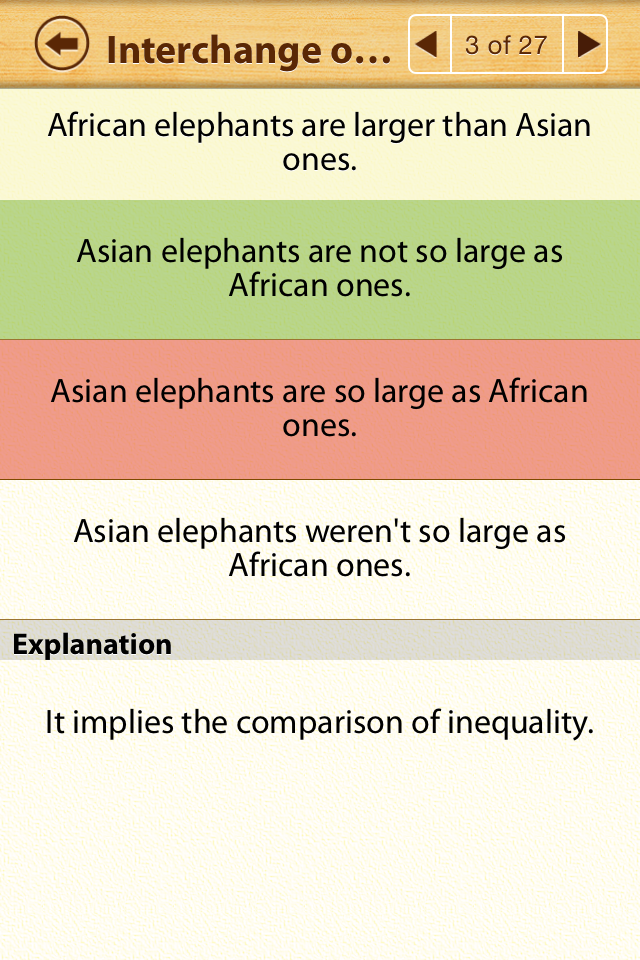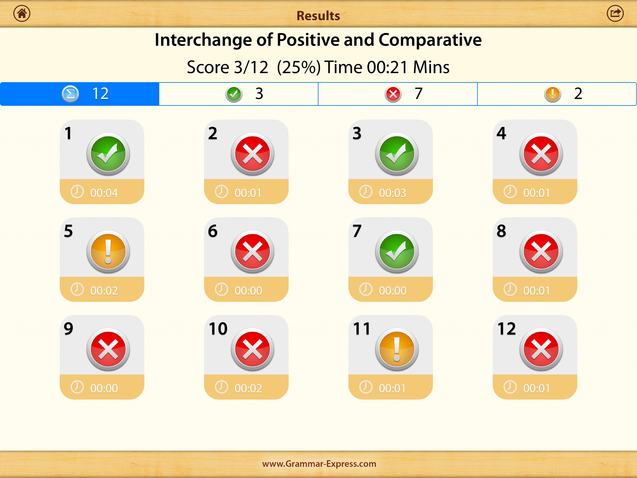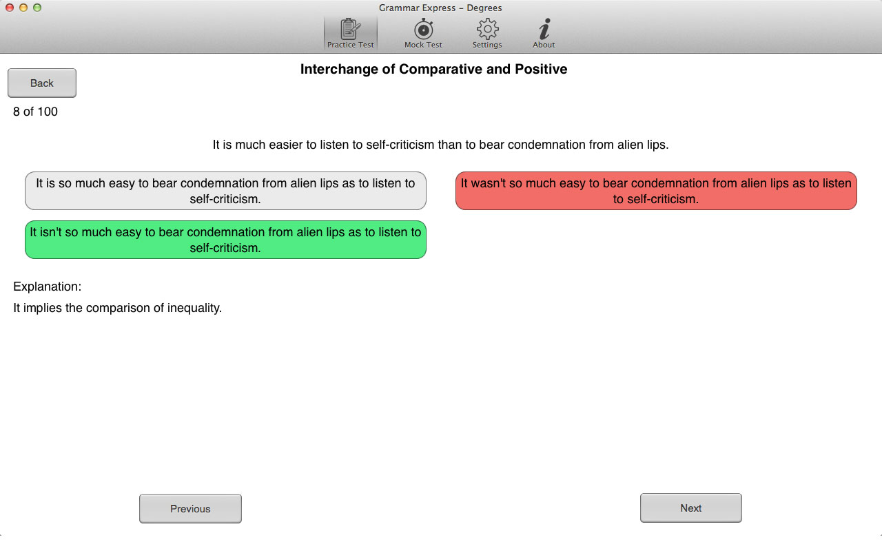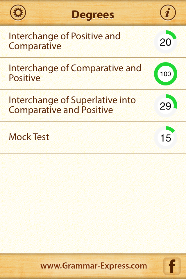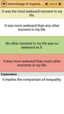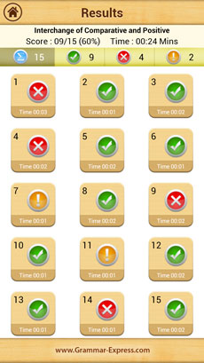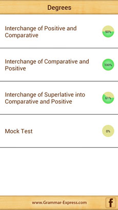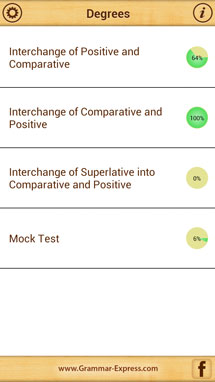 Grammar Express: Degrees is the complete course in mastering the use of variety of expressions in writing English. It contains over 26 pages of lessons explaining how to change a sentence from one grammatical form into another without changing its meaning with several examples. Its a valuable exercise for it teaches you how to introduce variety in writing English. You can learn the grammar rules, study the examples and test their understanding by taking quiz. At the end of quiz the user is presented with test summery and explanation for each test question. Grammar Express can help you to improve your understanding of Degrees and make use of them in your writing for greater effect. Custom timer setting can assist you to improve response times under exam time constraints. Research suggest that kids and adults learn most quickly when playing learning games with real-time error-feedback. Grammar Express provides learners with an opportunity to improve strategies for grammar success.