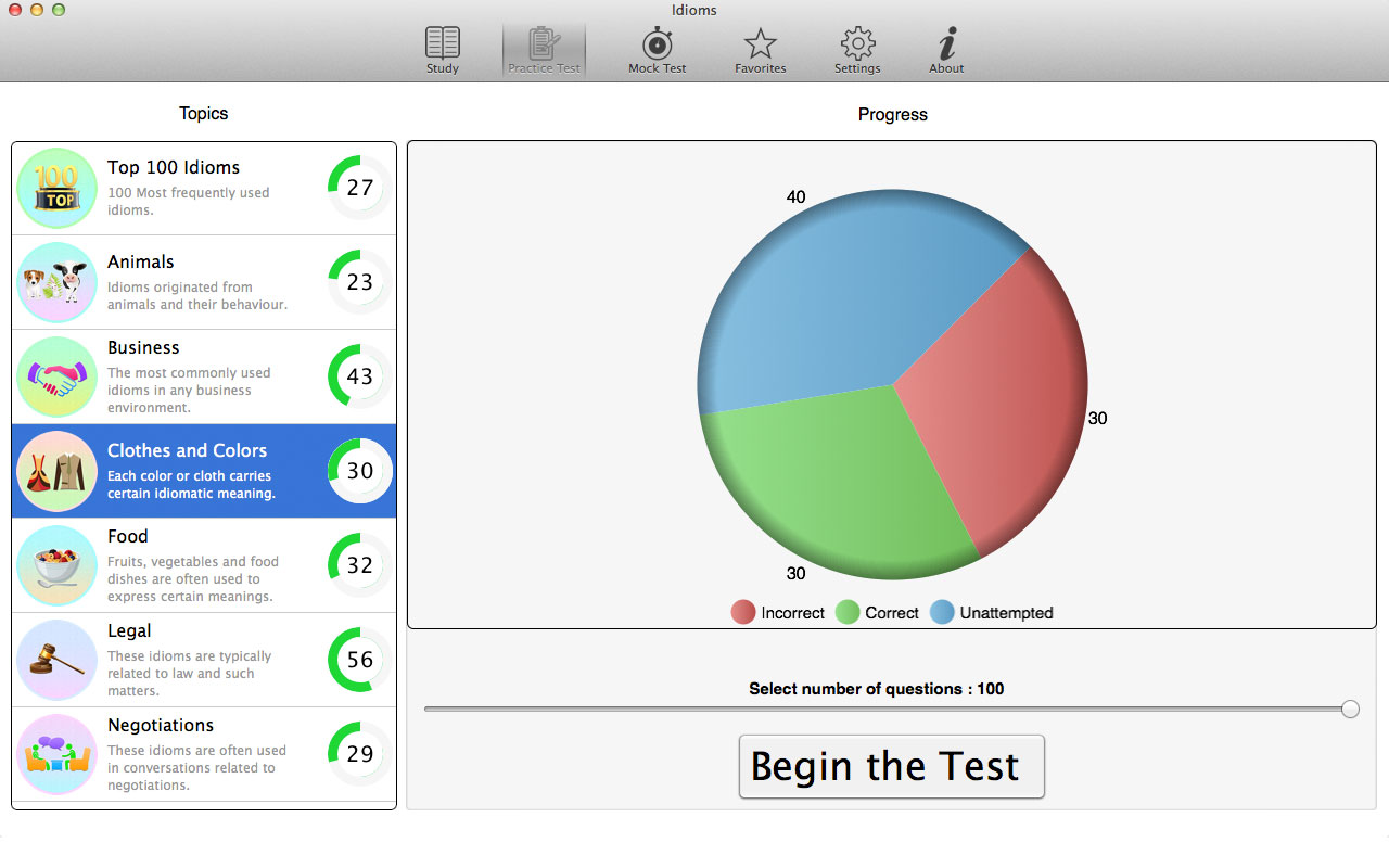You can study the idioms by topic. All questions are sorted by topic. It also tells you the areas that each topic covers.