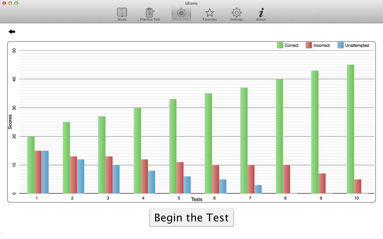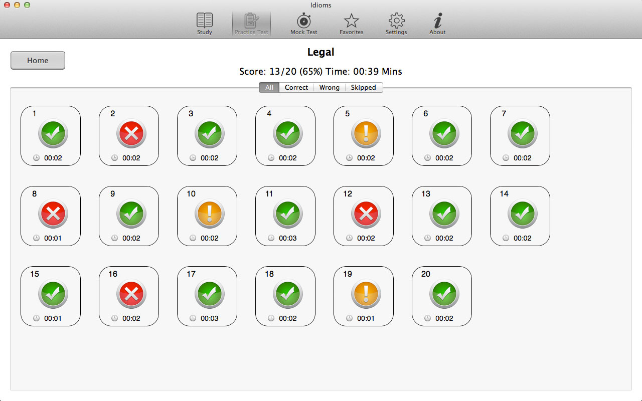 Idioms can help learners to improve their understanding and usage of idioms. Custom timer setting can assist learners to improve response times under exam time constraints.