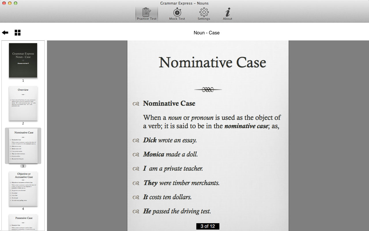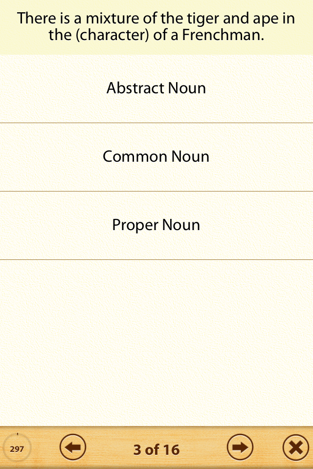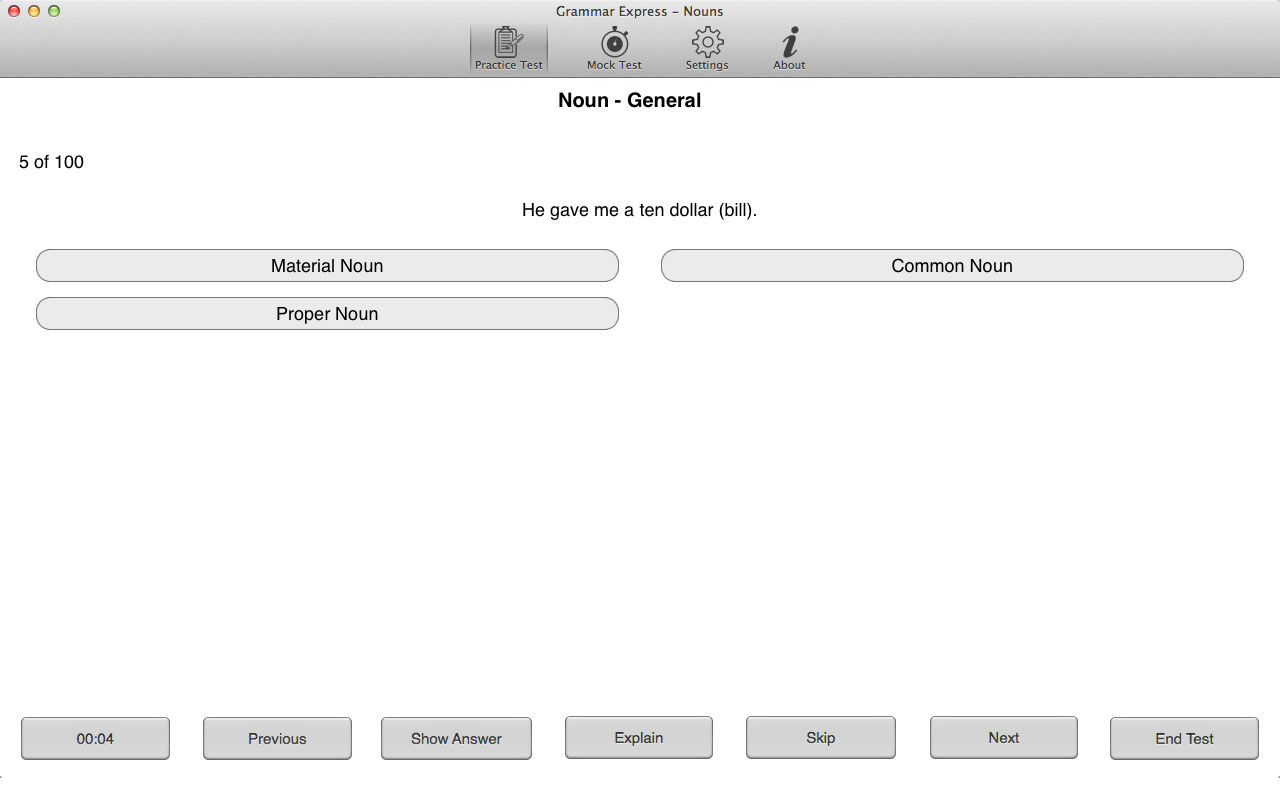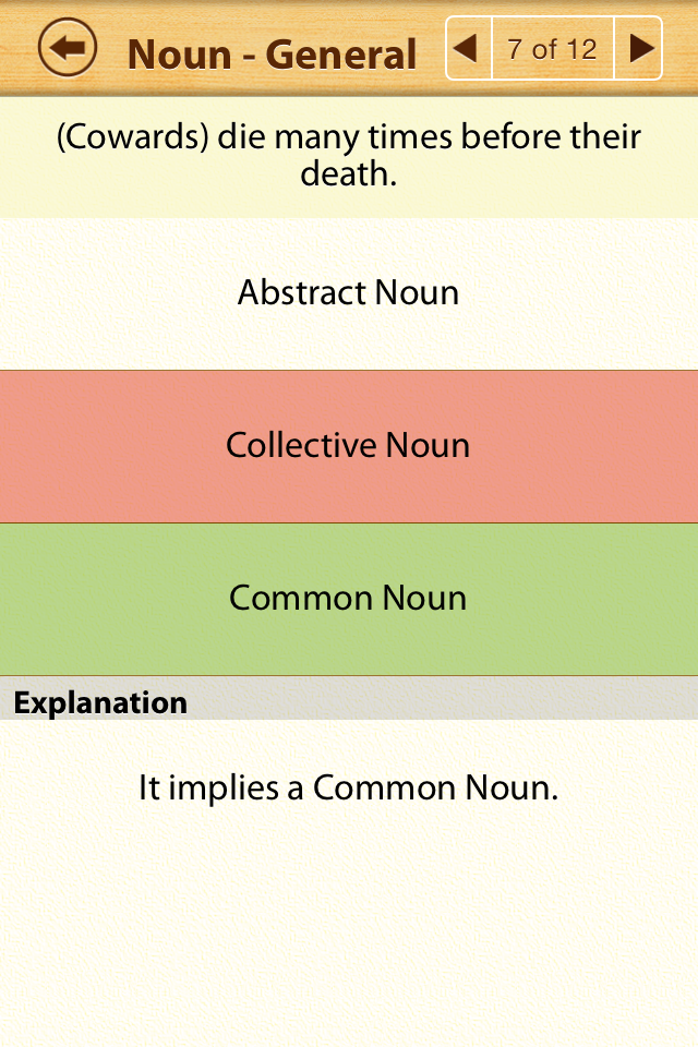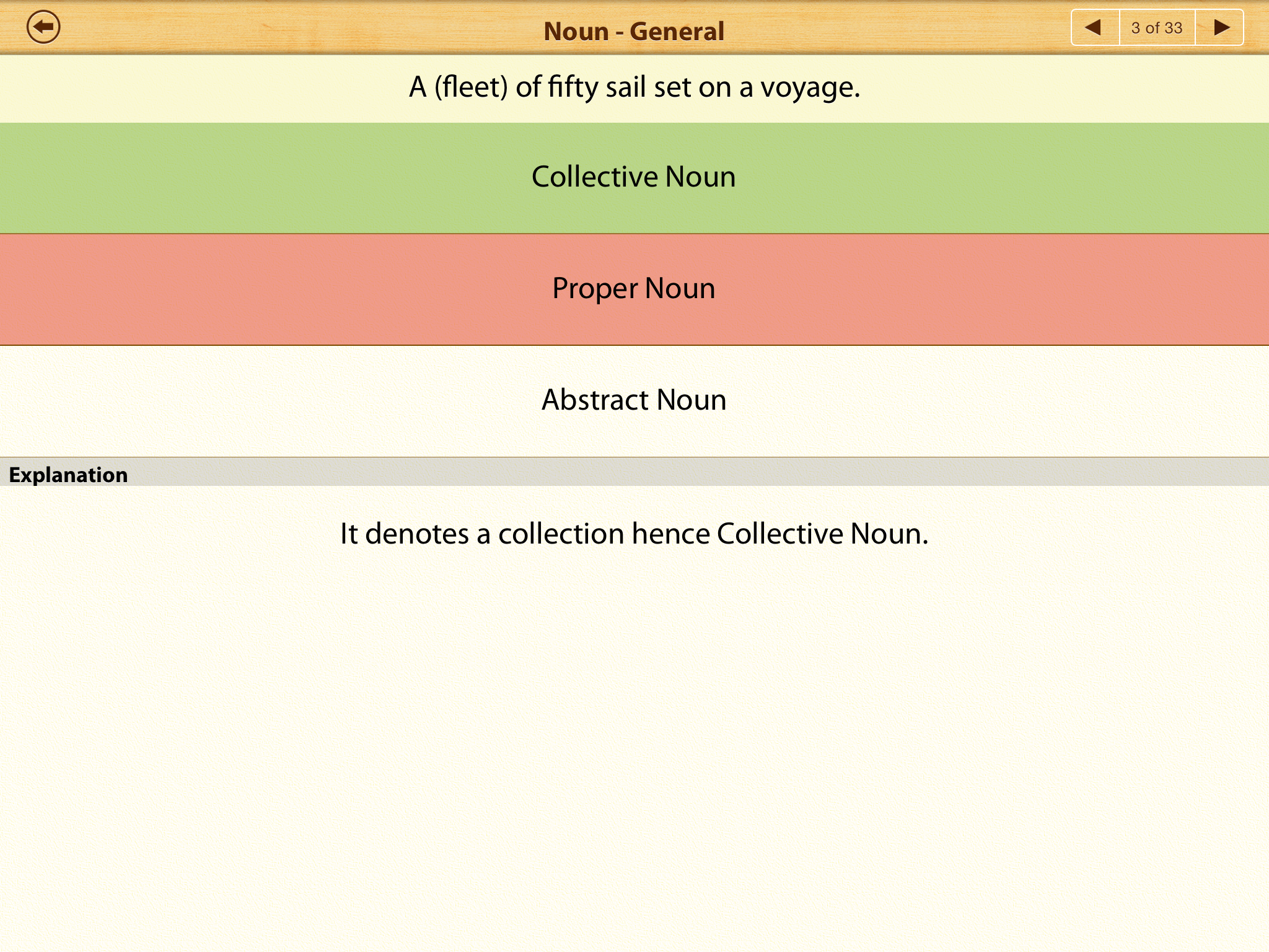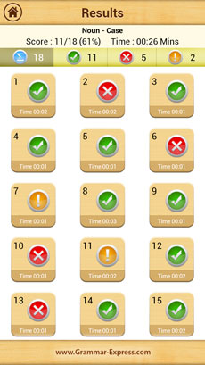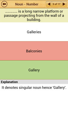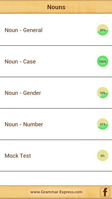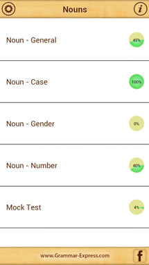 Grammar Express: Nouns is the complete course in mastering the kinds of noun such as common noun, proper noun, collective noun, material noun and abstract noun. It contains over 48 pages of lessons explaining Noun-Number, Gender and Case with several examples. You can learn the grammar rules, study the examples and test their understanding by taking quiz. At the end of quiz the user is presented with test summery and explanation for each test question. Grammar Express can help you to improve your understanding of kinds of noun and their classification into concrete and abstract noun. Custom timer setting can assist you to improve response times under exam time constraints. Research suggest that kids and adults learn most quickly when playing learning games with real-time error-feedback. Grammar Express provides learners with an opportunity to improve strategies for grammar success.