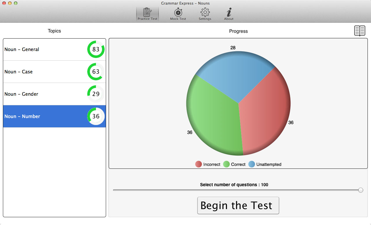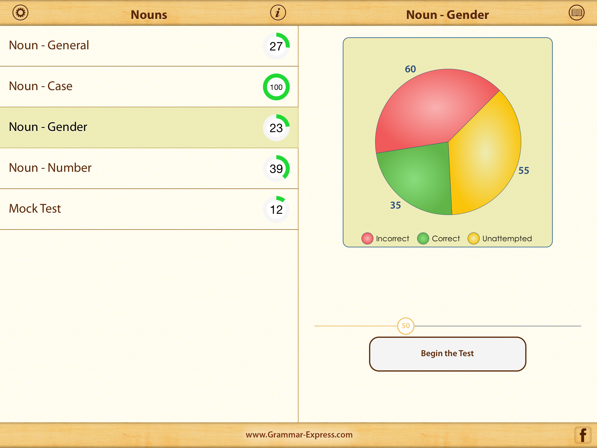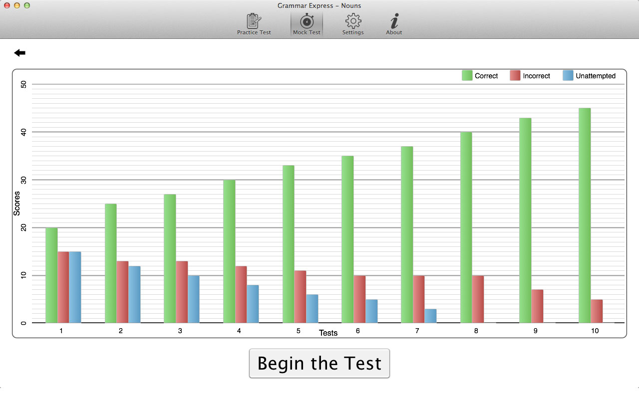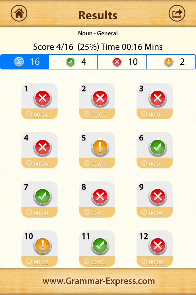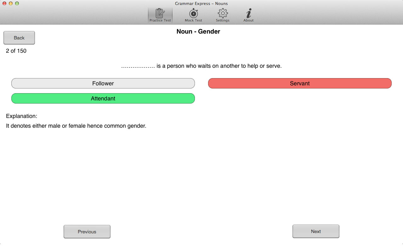 Grammar Express: Nouns is the complete course in mastering the kinds of noun such as common noun, proper noun, collective noun, material noun and abstract noun. It contains over 48 pages of lessons explaining Noun-Number, Gender and Case with several examples. You can learn the grammar rules, study the examples and test their understanding by taking quiz. At the end of quiz the user is presented with test summery and explanation for each test question. Grammar Express can help you to improve your understanding of kinds of noun and their classification into concrete and abstract noun. Custom timer setting can assist you to improve response times under exam time constraints. Research suggest that kids and adults learn most quickly when playing learning games with real-time error-feedback. Grammar Express provides learners with an opportunity to improve strategies for grammar success.